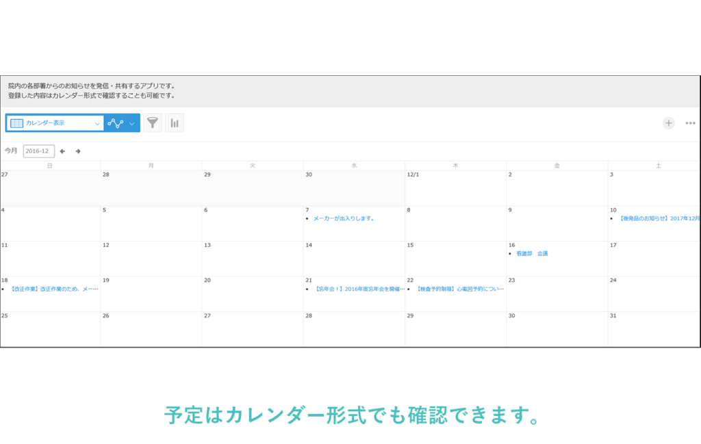 院内掲示板では、院内の各部署からのお知らせを共有することができ、院外から確認することも可能です。
