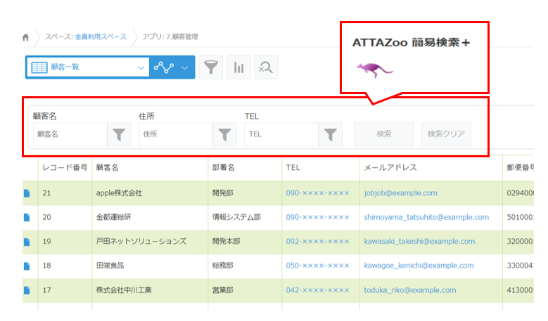 例えば、先の例にありました「検索機能」はATTAZoo+(JBアドバンスト・テクノロジー株式会社提供)の簡易検索を使うと、好きな項目を選択して検索窓を設定することができます。