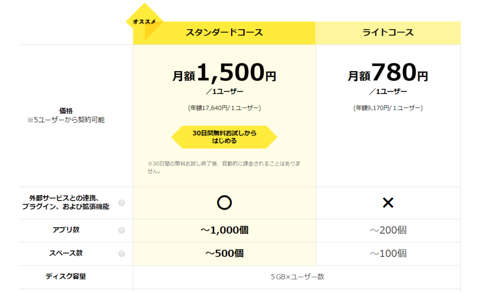 kintoneの2つのプランのうち、プラグインを利用するためにはスタンダードプランの契約が必要になります。