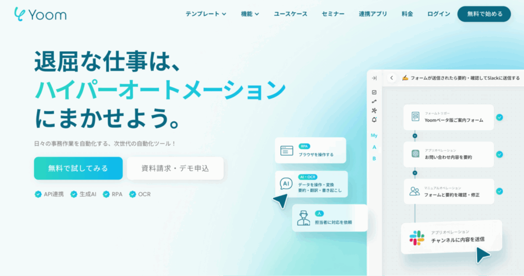 Yoomは、日々の事務作業を自動化する次世代のノーコードツールです。「ハイパーオートメーション」を活用することで、従来のRPAを超えた幅広い業務を自動化できます。